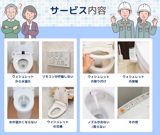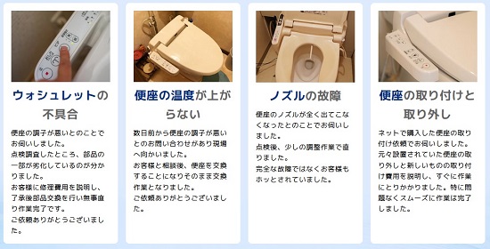 名古屋市で対応可能な温水便座、ウォシュレットの修理サービスとなります。その他のトラブルやご相談に関しましてはお気軽に受付窓口までお問い合わせください。